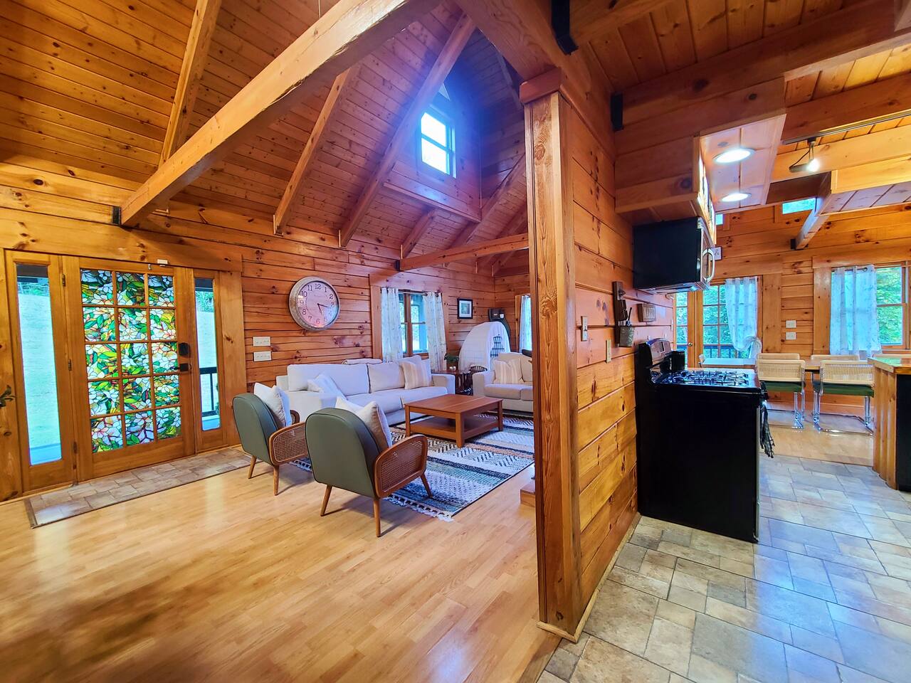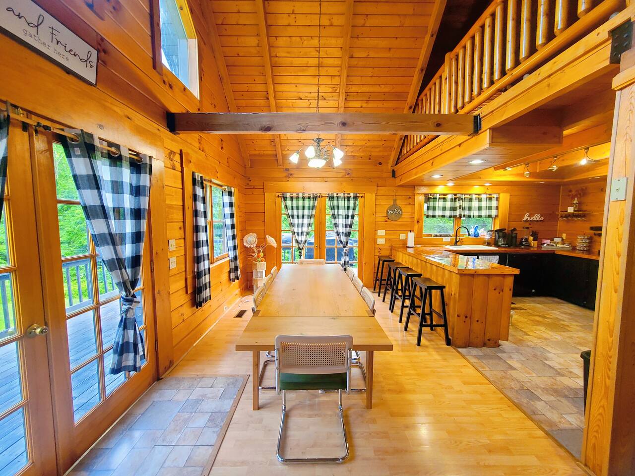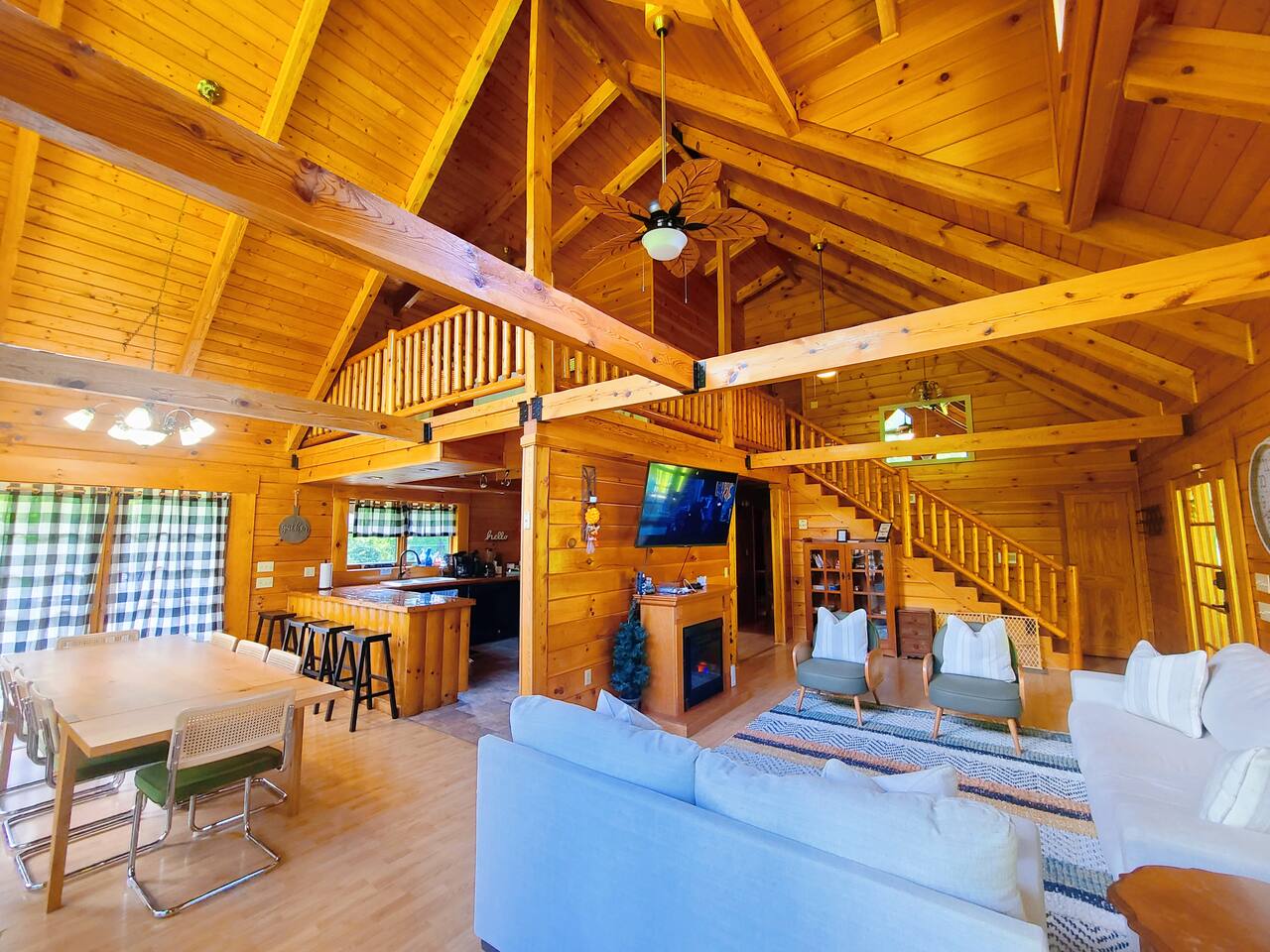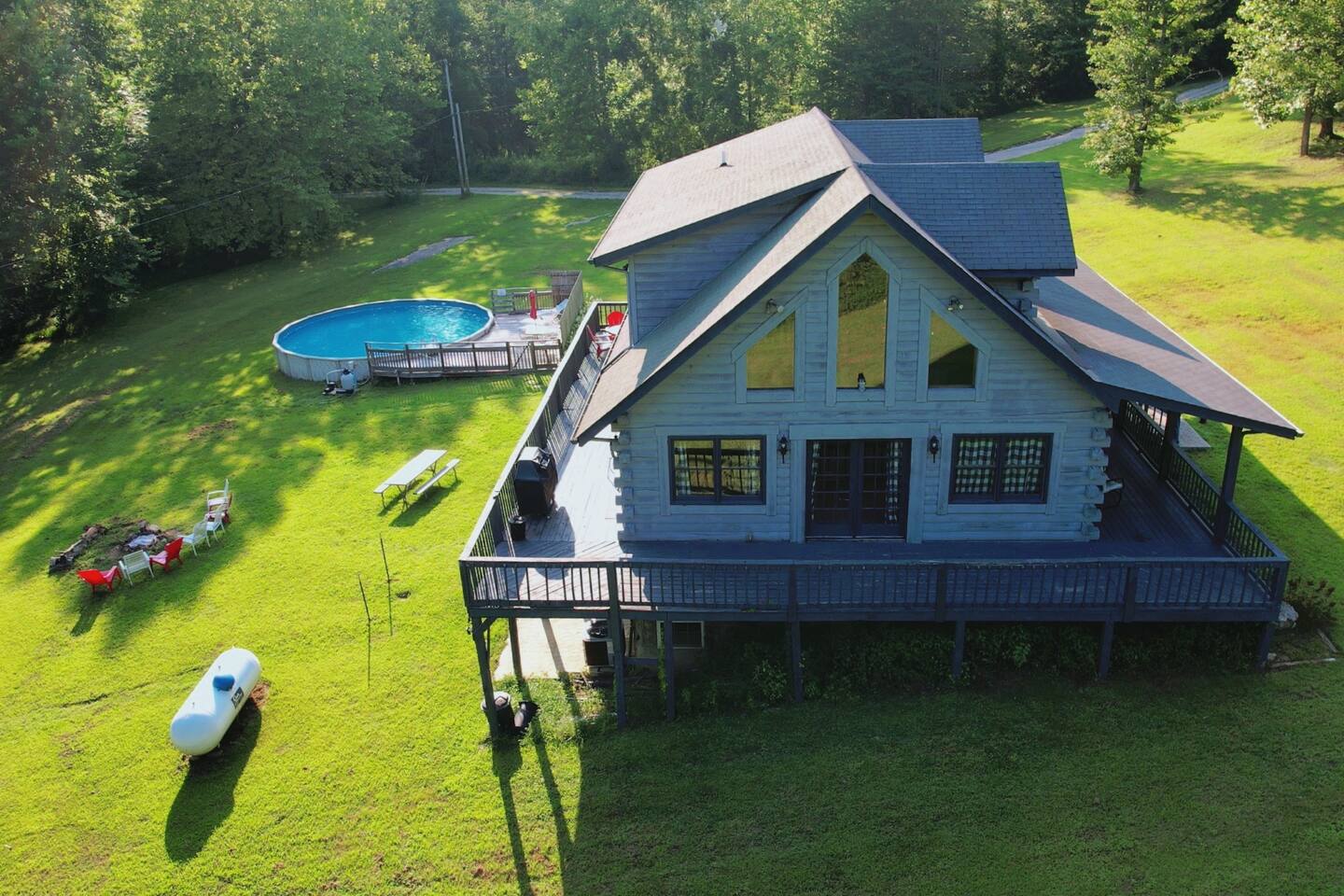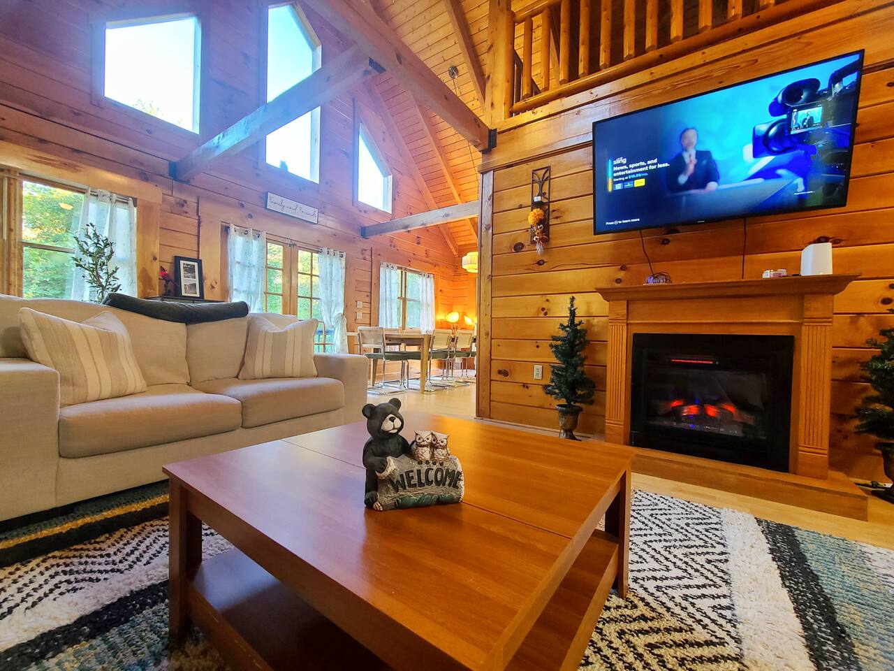 Sunlight spills across rich wood interiors, the scent of pine lingers in the air. Whether you’re gathered around the fire pit under a blanket of stars or soaking in the hot tub after a day of adventure, The Grey House is made for moments you’ll never forget. This spacious cabin blends rustic charm w/ modern comfort. Bring your four-legged family members along! Spend mornings sipping coffee on the porch, afternoons splashing in the pool, & evenings cooking together in the fully equipped kitchen.